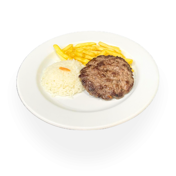 Pão de hambúrguer, hambúrguer, cebola, fiambre, queijo, maionese e ketchup
