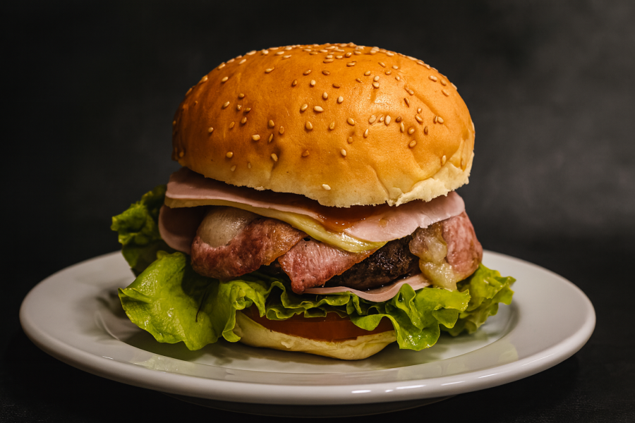 Pão de hambúrguer, hambúrguer, fiambre, queijo, maionese e ketchup
